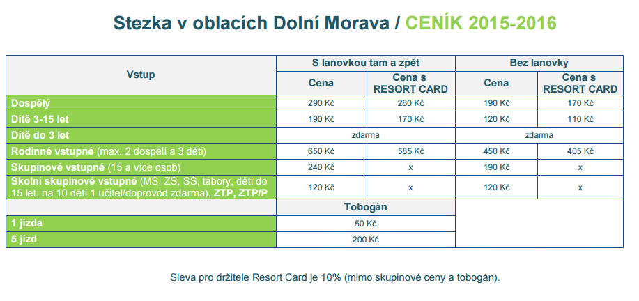 Cenník (kliknutím na obrázok si ho zväčšíte)V okolí Stezky v oblakoch sa nachádza aj mnoho ďalších aktivít a atrakcií:
