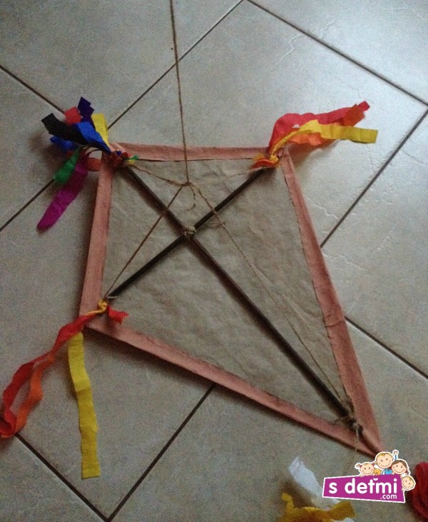 10. Zo zadnej strany šarkana priviažte na spodnú stranu kúsok špagátika, ktorý bude slúžiť ako chvostík. Na špagátik / chvostík postupne priväzujte farebný papier alebo stužky. Po priviazaní poslednej mašličky špagátik zauzlite, aby mašličky pri púšťaní šarkana neskĺzli.