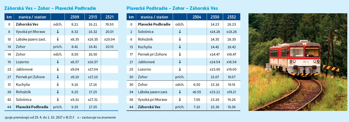 Vlak s menom „Záhoráčik“ bude premávať na tejto trati v sezóne od 29.apríla do 1. októbra 2017, a to v sobotu, nedeľu a v dňoch pracovného pokoja. Súpravu tvorí modernizovaná motorová jednotka s kapacitou 88 miest na sedenie. Táto súprava premáva celoročne každodenne na trati Zohor – Záhorská Ves, a cez víkend a vo sviatkoch bude zo Záhorskej Vsi cez Zohor do Plaveckého Podhradia a späť premávať dva razy za deň.