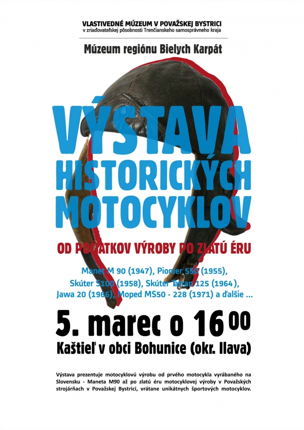 Vlastivedné múzeum v Považskej Bystrici a Múzeum regiónu Bielych Karpát Vás srdečne pozývajú na Výstavu historických motocyklov do zrekonštruovaného kaštieľa v obci Bohunice (okr. Ilava). Otvorenie výstavy sa uskutočnilo 5. marca 2013 o 16:00 h.