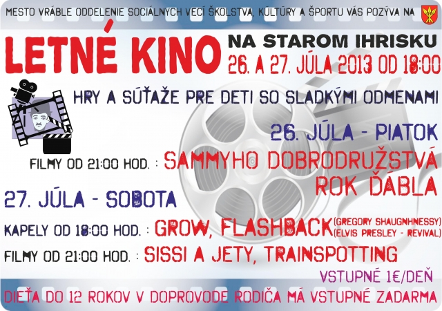 Mesto Vráble, Oddelenie sociálnych vecí, školstva, kultúry a športu Vás v rámci Vrábeľského kultúrneho leta 2013 pozýva na víkendový filmový relax pod holým nebom, ktorý bude prebiehať v dňoch 26. a 27. 7. 2013 na Starom ihrisku vo Vrábľoch.