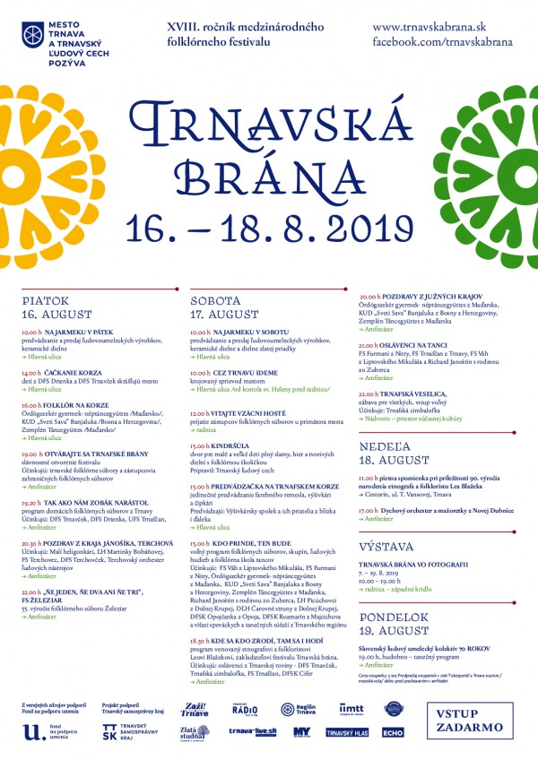 18. ročník Medzinárodného folklórneho festivalu Trnavská brána sa uskutoční 16. – 18. 8. 2019. Organizuje ho Mesto Trnava v spolupráci s Trnavským ľudovým cechom a folklórnym súborom Trnafčan.
