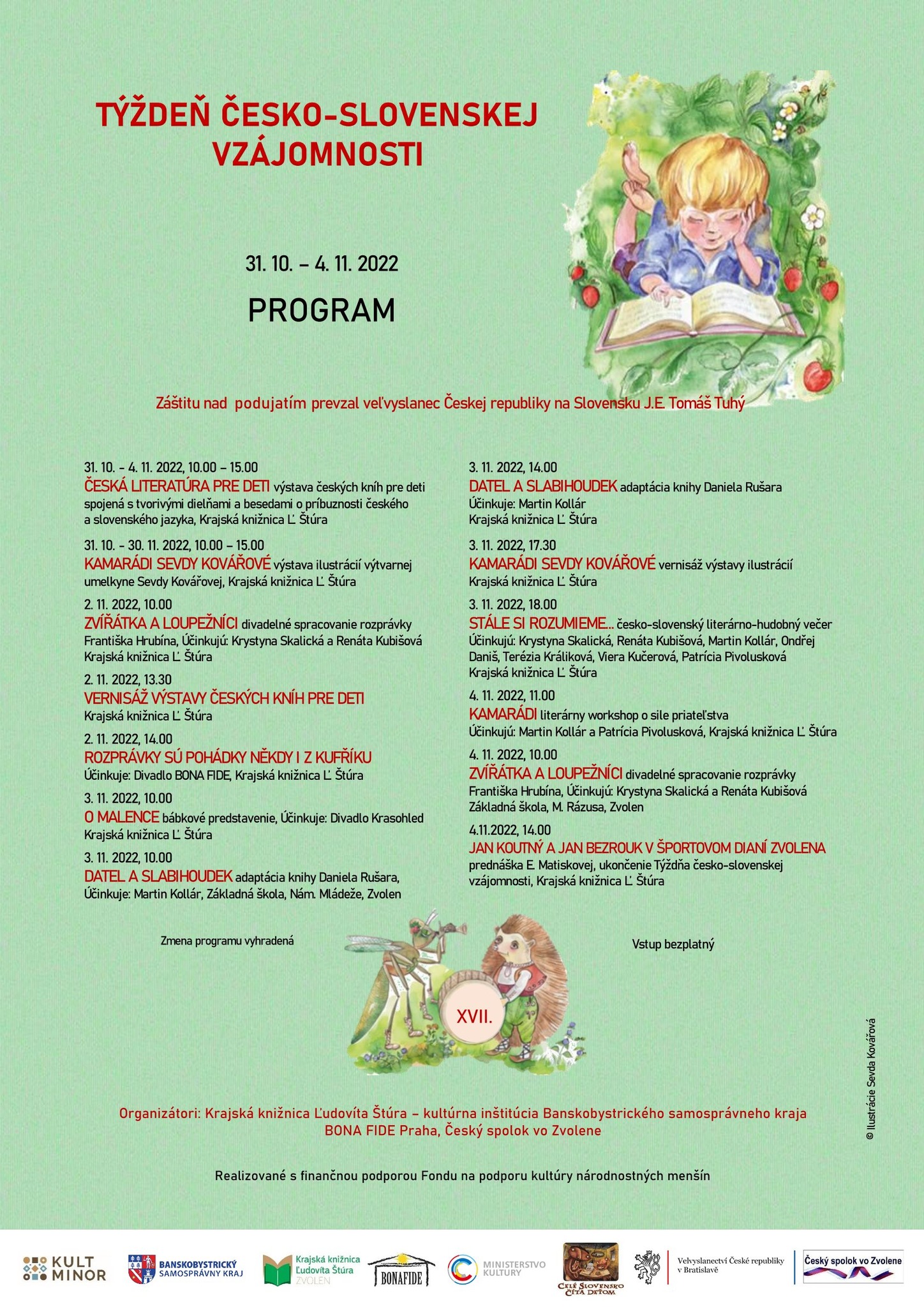 V Krajskej knižnici Ľudovíta Štúra sa v týždni od 31. októbra do 4. novembra 2022 uskutočnia pestré aktivity v rámci 17. ročníka Týždňa česko-slovenskej vzájomnosti. Podujatie má vo Zvolene dlhoročnú tradíciu, získalo si veľkú obľubu medzi širokou verejnosťou. Hlavným organizátorom podujatia je Banskobystrický samosprávny kraj, Krajská knižnica Ľudovíta Štúra vo Zvolene, BONA FIDE Praha, Český spolok vo Zvolene.