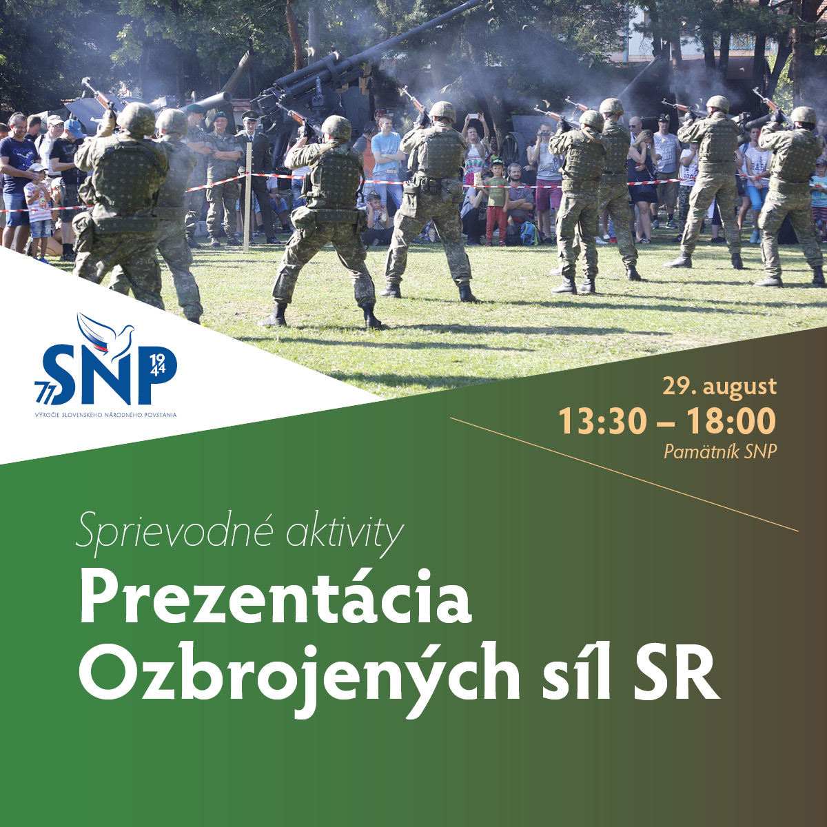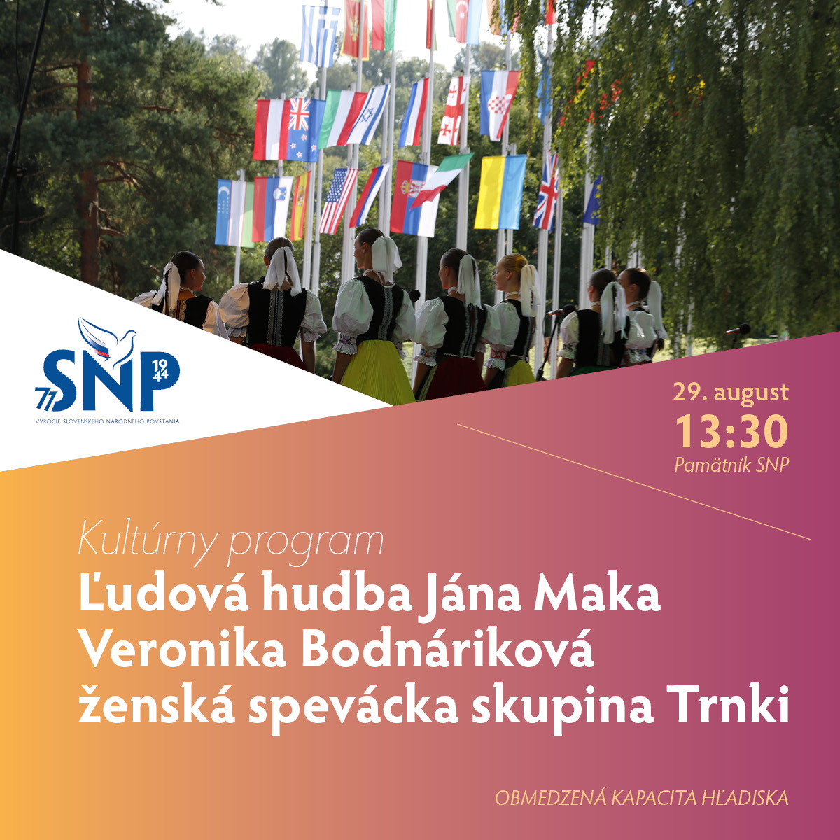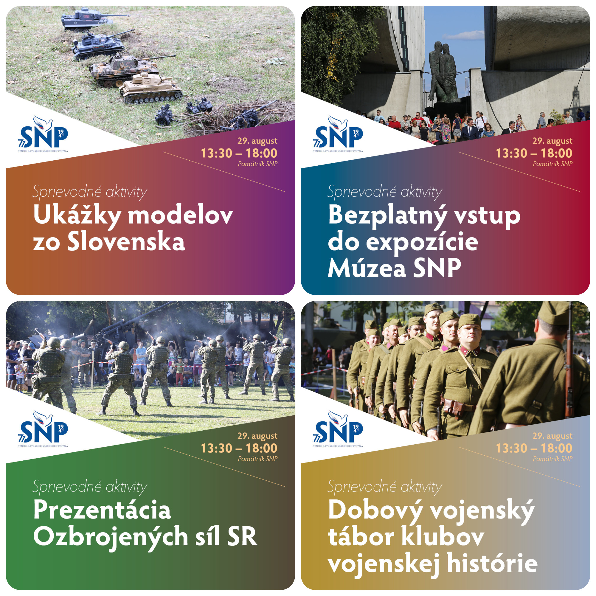 Múzeum SNP pre verejnosť pripravuje popoludňajší program s viacerými sprievodnými aktivitami. Od 13:30 do 17:00 sa na hlavnej tribúne pred Pamätníkom SNP uskutoční kultúrny program, avšak za podmienky dodržania protiepidemiologických nariadení, ktoré budú platné v danom období. Priestory stálej expozície a kinosály budú pre verejnosť sprístupnené od 13:30 do 18:00. O režime koncertu Štátnej opery, ktorý sa uskutoční dňa 28. augusta, a taktiež o podmienkach účasti verejnosti dňa 29. augusta, budeme informovať priebežne na stránke www.muzeumsnp.sk a sociálnych sieťach Múzea SNP.