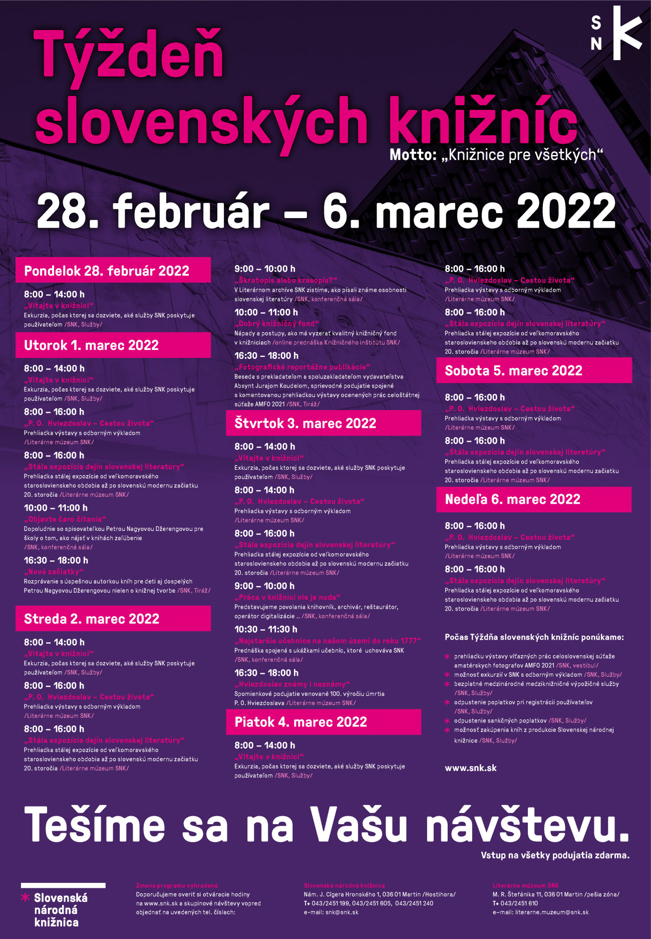 Slovenská národná knižnica aj tento rok pripravuje v rámci tohto týždňa pre vás množstvo podujatí v sídelnej budove i v Literárnom múzeu SNK.