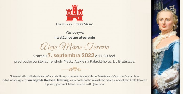V jún 1741 bola v Bratislave korunovaná Mária Terézia za uhorskú kráľovnú. O vyše 280 rokov v Starom Meste, v tesnom susedstve Základnej školy Matky Alexie na Palackého 1, vznikne na jej počesť Alej Márie Terézie. Pozývame vás na jej slávnostné otvorenie v stredu 7. 9. o 17,30 h. pred budovou ZŠ Matky Alexie na Palackého 1.