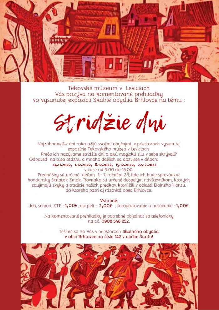 Tekovské múzeum v Leviciach Vás srdečne pozýva do svojej vysunutej expozície do Skalných obydlí v Brhlovciach na komentované prehliadky s témou „Stridžie dni“.