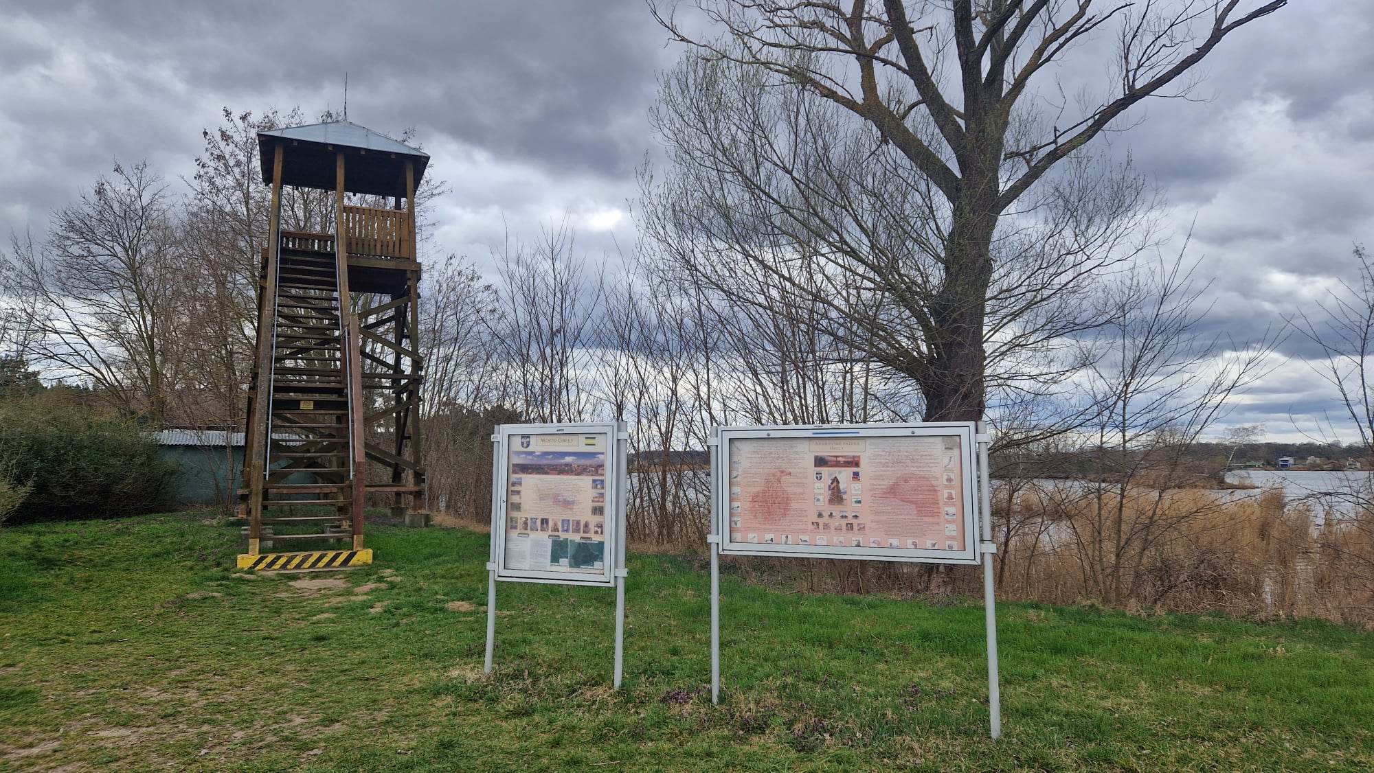 Rozhľadňa je drevenej konštrukcie a má výšku 8 metrov a jednu plošinu bez lavičiek. Vybudovaná bola v roku 2009 a je vhodná na pozorovanie vodného vtáctva a okolitej prírody a cestou hore musíte zdolať 27 krokov (26 schodov). Hneď vedľa rozhľadne sa okrem dvoch informačných tabúľ nachádza aj drevený prístrešok, kde si viete posedieť či v prípade zlého počasia sa schovať. Objekt sa nachádza priamo medzi dvomi Adamovskými jazerami, neďaleko parkoviska po ľavej strane chodníka, ak prichádzate z hlavnej cesty. Schody sú trošku strmšie, ale určite to ruka v ruke s rodičmi zvládnu aj tí najmenší návštevníci a pomôže im aj zábradlie na oboch bokoch.