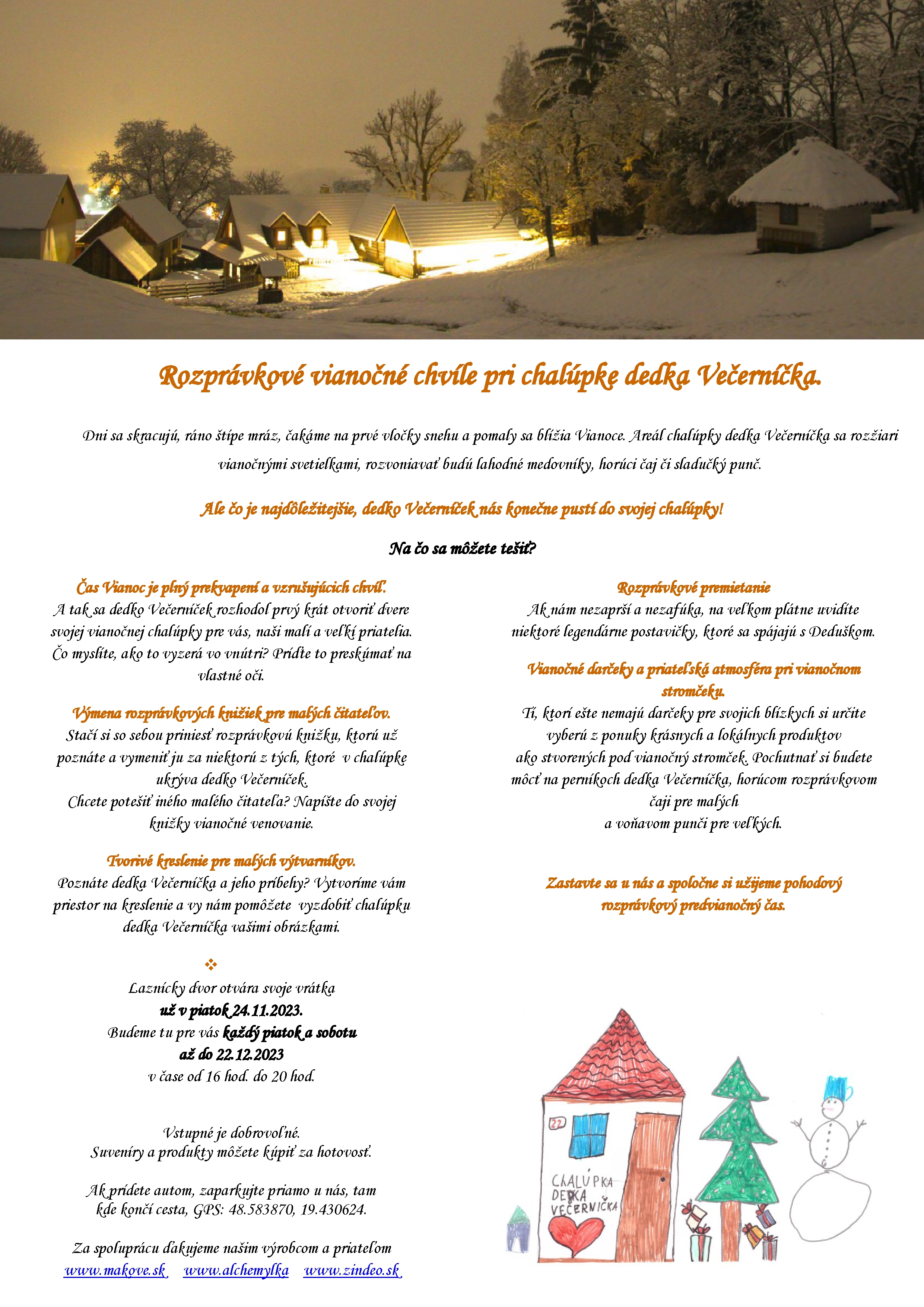 Dni sa skracujú, ráno štípe mráz, čakáme na prvé vločky snehu a pomaly sa blížia Vianoce. Areál chalúpky dedka Večerníčka sa rozžiari vianočnými svetielkami, rozvoniavať budú lahodné medovníky, horúci čaj či sladučký punč. Ale čo je najdôležitejšie, dedko Večerníček nás konečne pustí do svojej chalúpky!