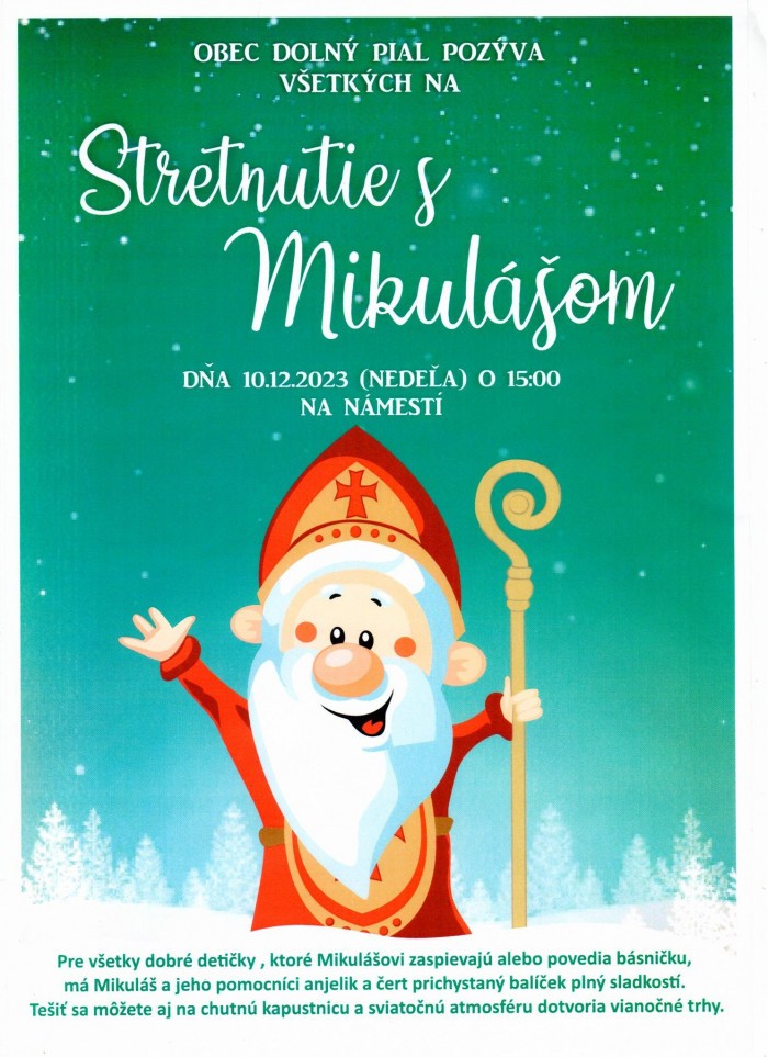Obec Dolný Pial oznamuje, že organizuje stretnutie s Mikulášom. Toto stretnutie je určené hlavne pre deti našej obce, to znamená, že balíčky od Mikuláša dostanú len deti s trvalým pobytom v obci Dolný Pial. Pre deti, ktoré nemajú v obci trvalý pobyt a rodičia alebo starí rodičia chcú aby dostali balíček, môžu tento balíček s označením mena dieťaťa priniesť na Obecný úrad do 7.12.2023. Ďakujeme za pochopenie.