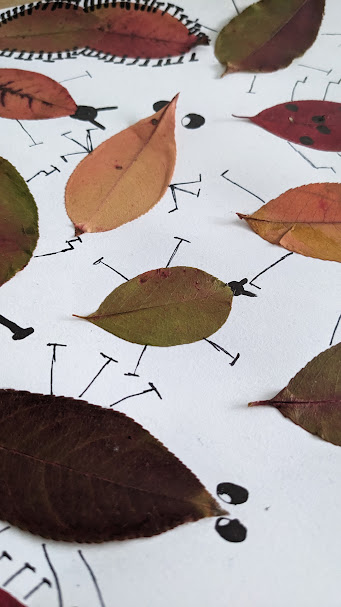 Postup je veľmi jednoduchý - stačí si nalepiť listy na papier a nakresliť chrobákov rôznych druhov - lienky, stonožky, chrobáčikov - kreatíve sa medze nekladú!