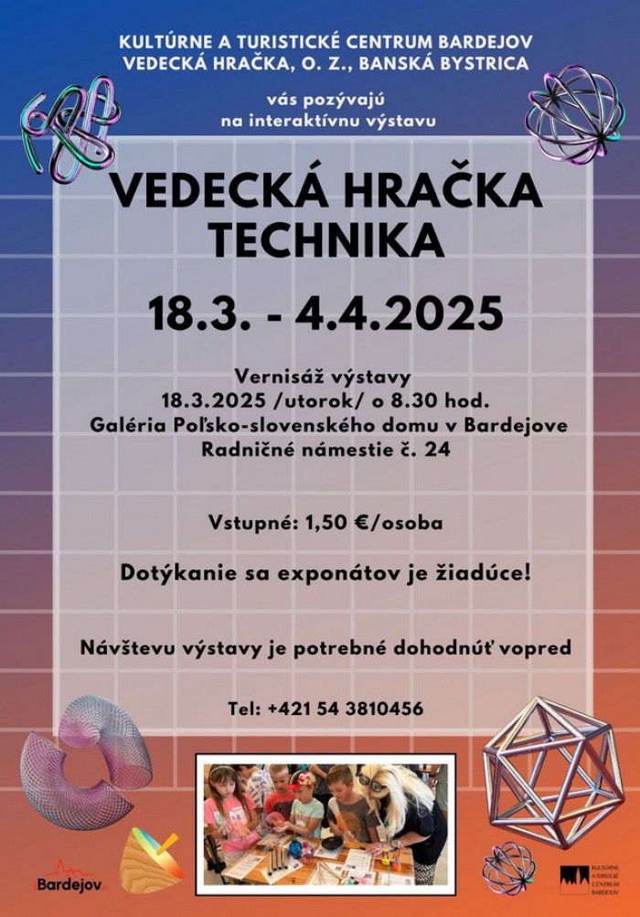 Kultúrne a turistické centrum Bardejov v spolupráci s o.z., Vedecká hračka Banská Bystrica vás pozývajú do galérie Poľsko-slovenského domu na Radničnom námestí 24 v Bardejove, na interaktívnu výstavu vedeckých hračiek pod názvom TECHNIKA - VEDECKÁ HRAČKA.  Výstava prispieva k naplneniu túžby malých i veľkých poznávať a učiť sa hrou. Druhá časť názvu výstavy – vedecká hračka – je odborné pomenovanie dobrej a kvalitnej hračky, ktorá pri hre demonštruje, približuje konkrétny prírodný, alebo technický fenomén.