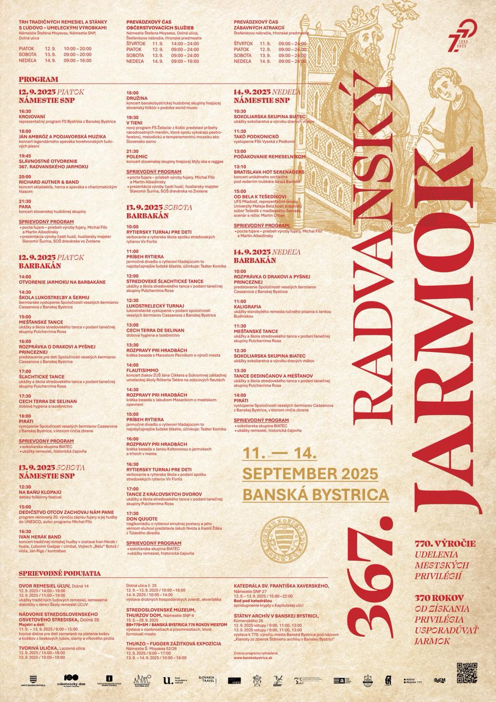 Radvanský jarmok je neodmysliteľnou súčasťou Banskej Bystrice už takmer 400 rokov a patrí k jej najväčším kultúrno-spoločenským podujatiam. V dňoch 11. až 14. septembra 2025 si aj vďaka nemu pripomenieme významné výročie, 770 rokov od udelenia listiny mestských privilégií mestu pod Urpínom. Tohtoročný 367. Radvanský jarmok opäť láka pestrým programom, ktorým verejnosti sprostredkujeme históriu – vzostupy a pády srdca stredného Slovenska. Lokalita pri Barbakáne sa premení na historické mestečko.