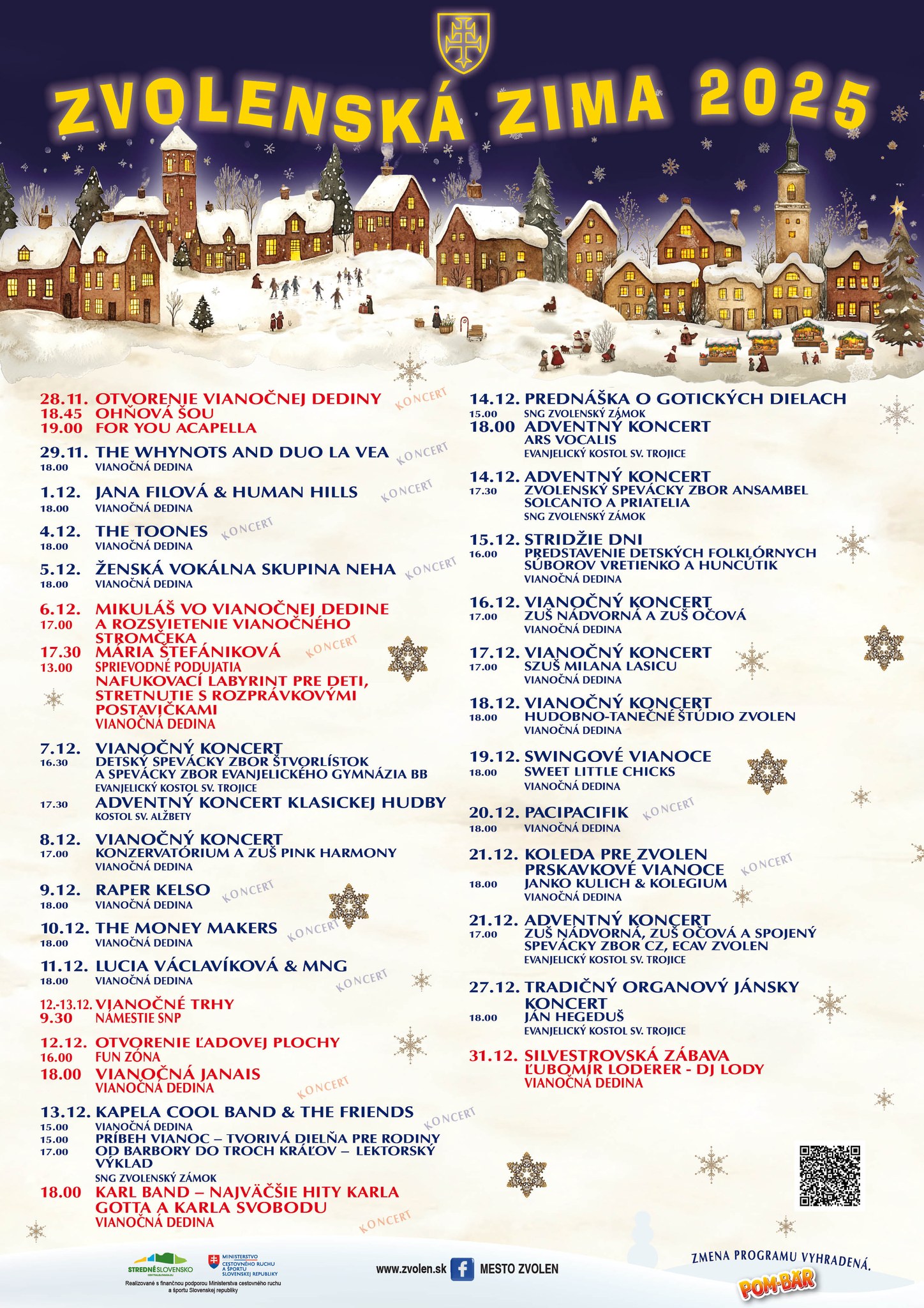 Po rozsvietení Vianočnej dediny sa v priebehu celého mesiaca môžete tešiť na koncerty rôznych žánrov, adventné vystúpenia v kostoloch, mikulášske prekvapenia, otvorenie klziska či silvestrovskú tancovačku – čaká nás pestrý december plný hudby, zábavy a pochopiteľne sviatočnej atmosféry.