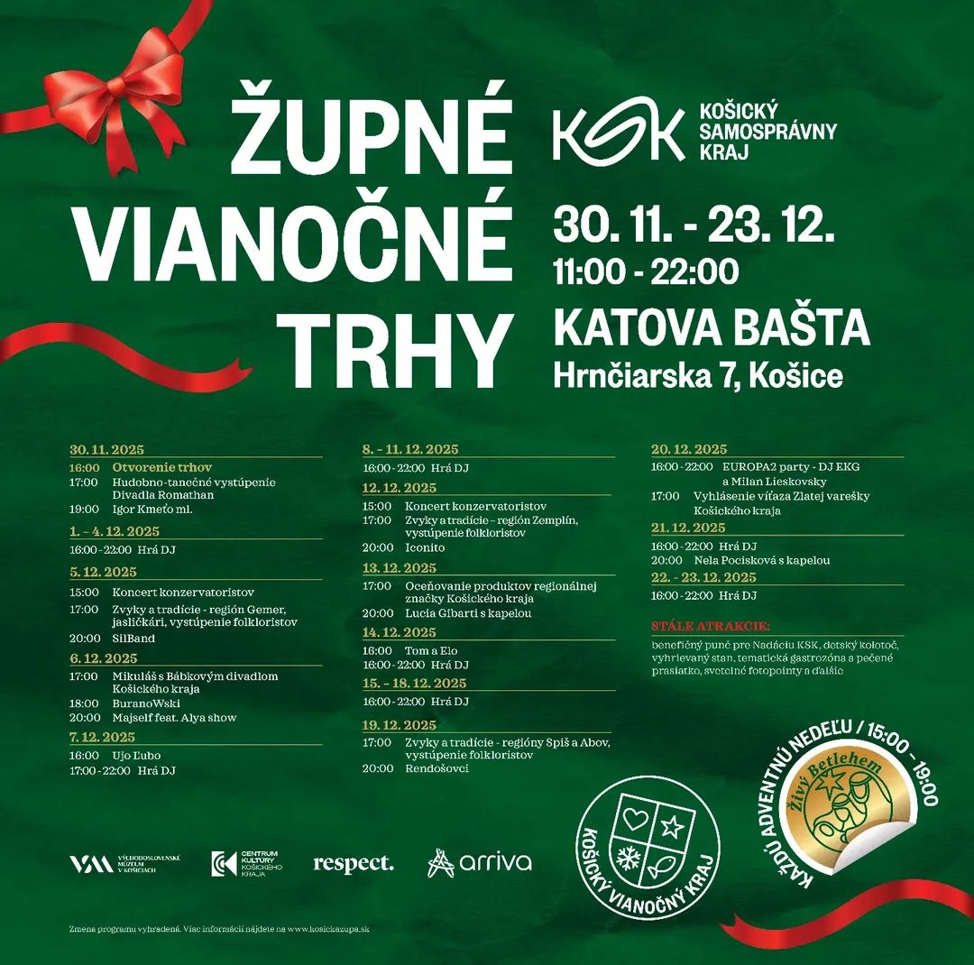 Čas do Vianoc môžu východniari odpočítavať spoločne so župou na Župných trhoch 2025. Po roku sa areál Katovej Bašty na Hrnčiarskej ulici v Košiciach zaplní stánkami, atrakciami, čarovnou atmosférou i hudbou nielen pre najmenších, lákavými dobrotami aj svetelnými fotopointami.