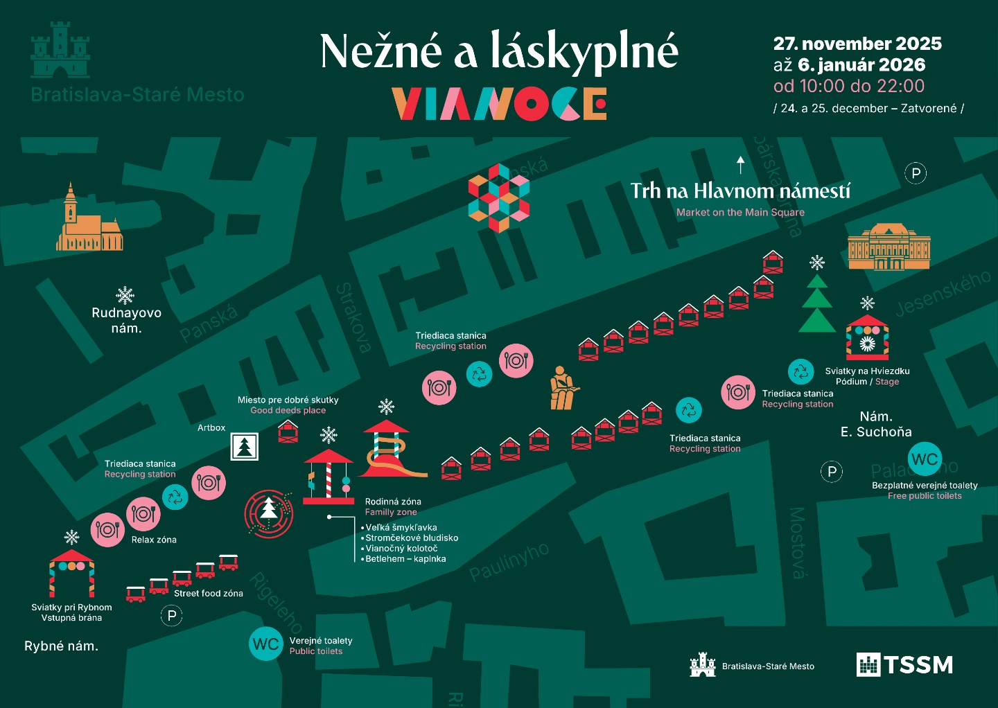 - Rodinná zóna so stromčekovým bludiskom, kolotočom a obľúbený vianočný kopec so šmýkačkou,