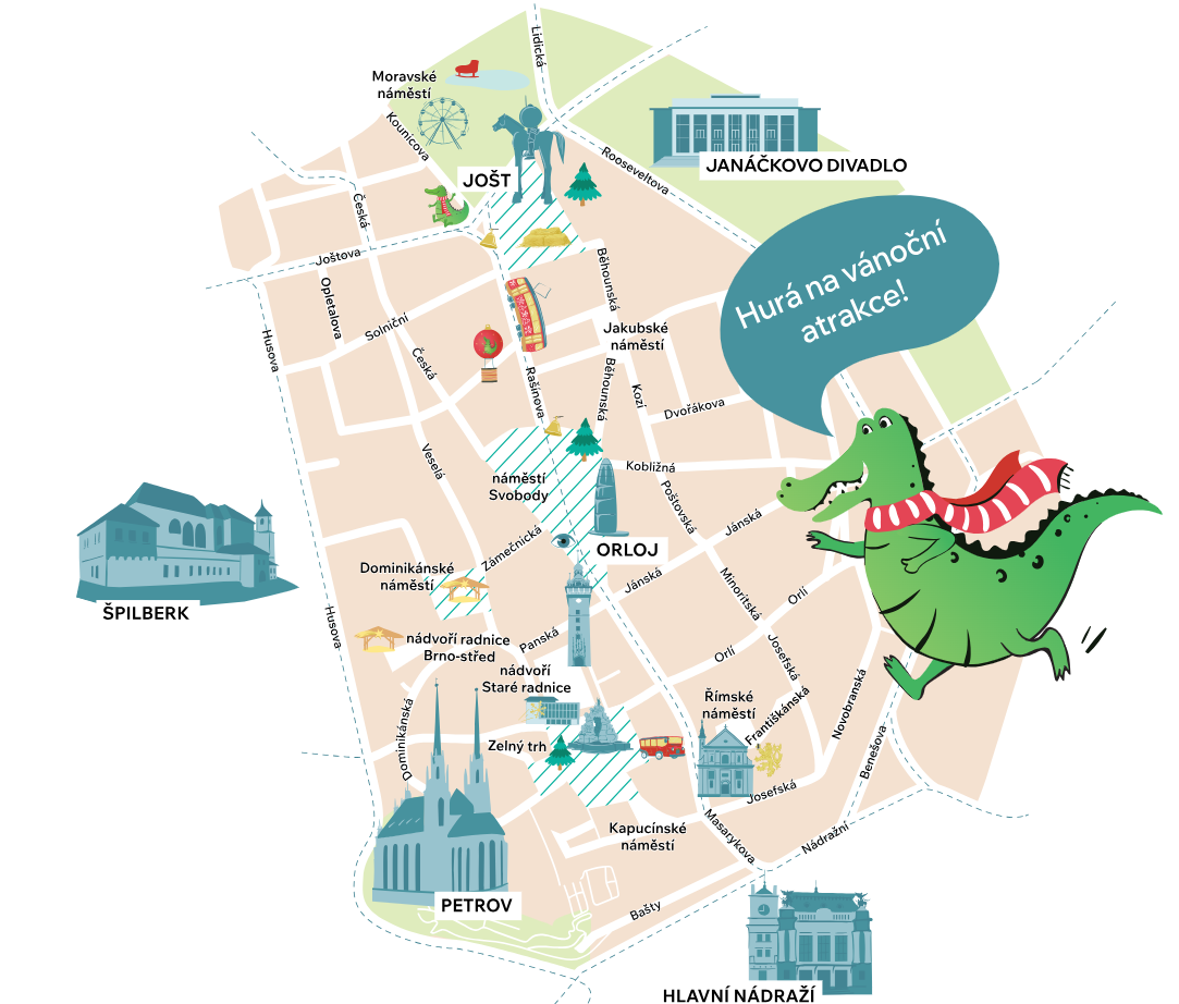 Medzi deviatimi stánkami tu nájdete tri venované medzinárodnej kuchyni, ktoré ponúknu občerstvenie z rôznych kútov sveta. Hoci v Brne, môžete tak počas vianočných trhov precestovať svet! Atmosféru doplní vianočná šalinka a radosť všetkých detí, ktoré sa jej zvezú.